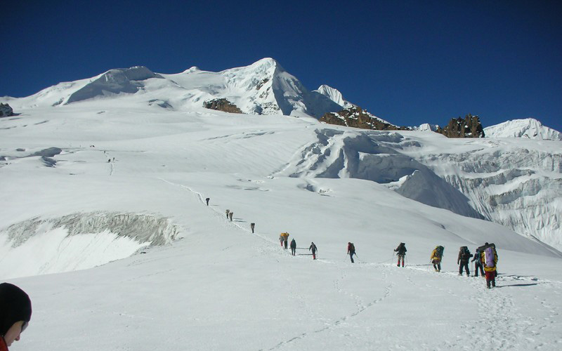 Mera peak is one of the famous trekking peak having 6,654 meter elevation, which is located to the south side of Mt. Everest. The trek to its base camp starts with the flight to Lukla and follows the trail Chhutanga the group will reach to base camp. If we have more time and interested on trek to Shivalaya we have another option. We can drive to Jiri and trek to lukla then follow the way to Mera base camp. There are few other routes which have some high and very difficult passes one some other routes, it's the barriers to get to Mera Base camp. The route via Lukla- Chutanga and base camp is easier. From this route we walk through forest having rhododendron , pine and many other plants. We can see beautiful view of Mt. Cho- Oyu and Numbur Himal and from the Mera Peak we can observe the marvelous view of renowned mountains such as Barunche, Kunchanjunga, Makalu to the eastside as well as Everest, Cho-Oyu, Khang Thega, Ama- Dablam to another. We can finish our climbing in one day that means we can go to the top and return to base camp in same day.